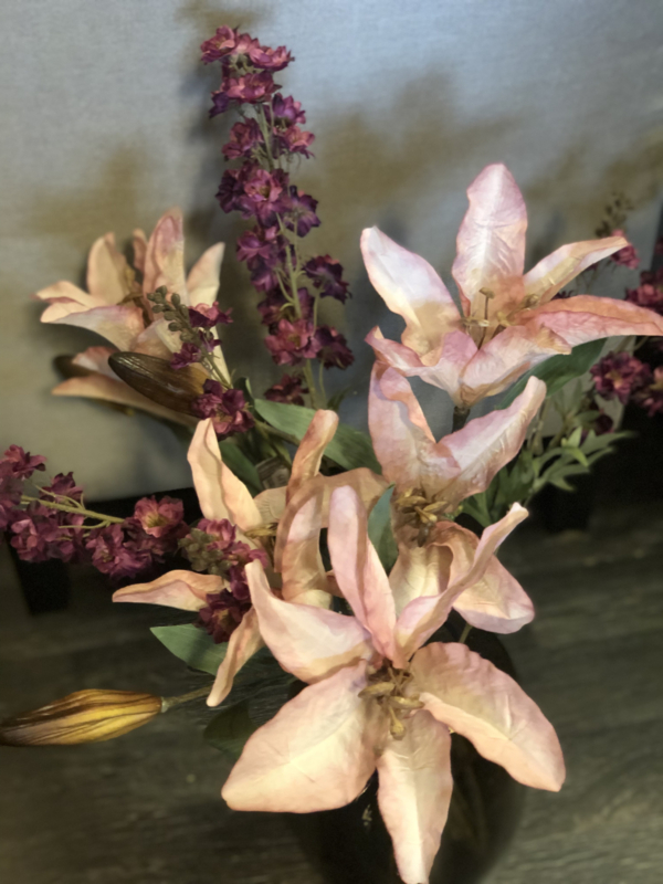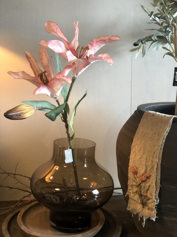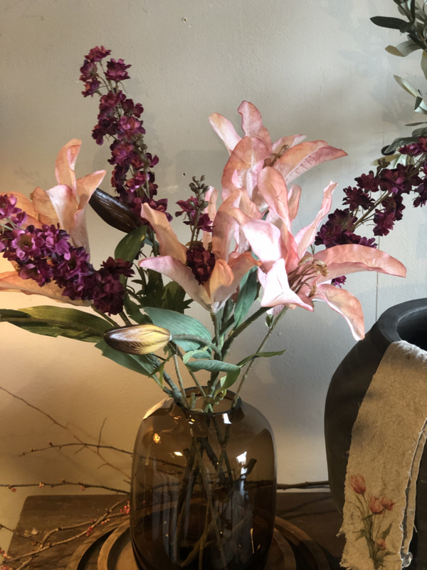 Lelie in een prachtige warme kleur. Een opvallende tak, mooi voor in een boeket zoals bv op de foto, of als blikvanger alleen in een vaas of kruik