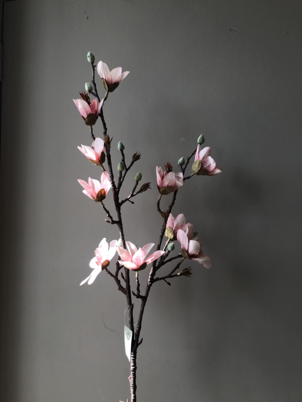 Roze magnolia. Een stevige tak met grote bloemen die direct sfeer in huis brengt.